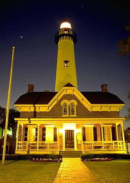 Located just east of Brunswick, Georgia, St. Simons Light marks the entrance to St. Simons Sound. The original tower of 1811 was destroyed by Confederates and was replaced by the present tower in 1872. Malaria plagued the work crews and later the keepers until nearby stagnant ponds were drained. The 104 foot tower still has the original third-order fresnel lens and Victorian keeper's quarters.